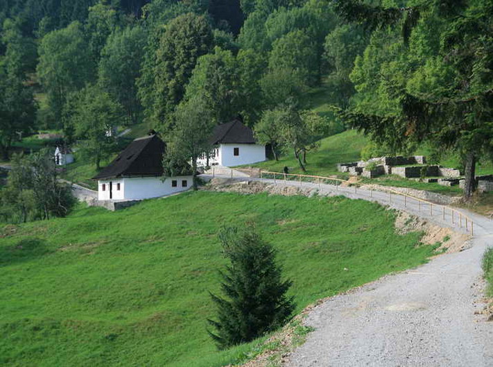 Obnovené domy a kaplnka na Kališti. Vpravo zvyšky vypálených domov.