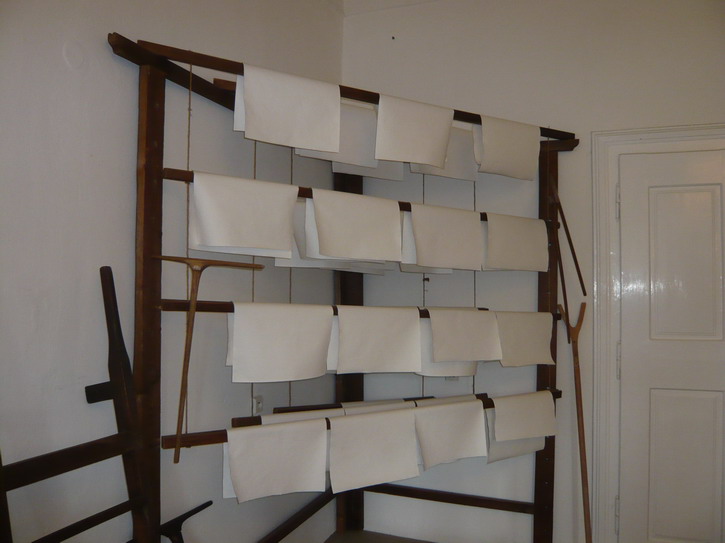 Po vylisovaní vody sa papiere rozvešajú na tradičné drevené sušiaky.